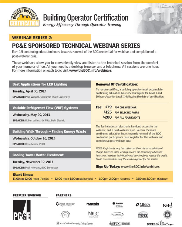 BOC offers live instructional webinars throughout the year to keep you informed on the dynamic field of facilities management. For the first time in 2013, we are offering 2 series and registration for both is open now! Learn practical solutions to deal with the energy hogs in your building from leading industry experts in areas such as demand reduction, lighting, and indoor air quality. Anyone with an interest in the topic is welcome to join and get the in-class BOC experience.