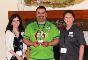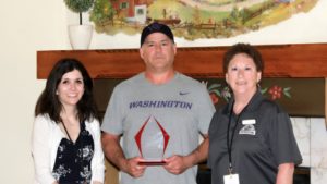 Melanie Danuser (left) and Carol Lewellen (right), Northwest Energy Efficiency Council, present DJ McClain (center), Construction and Maintenance Supervisor at the Washington State Criminal Justice Training Center, with the 2018 Energy Innovations Award at the 2018 Energy Facilities Connections Conference in Leavenworth, WA.