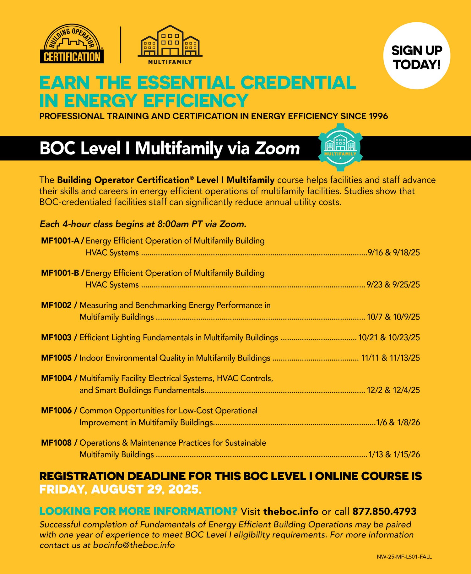 The Building Operator Certification (BOC) Level I Multifamily course helps facilities and staff advance their skill and careers in energy efficient operations of multifamily facilities.  Studies show that BOC-credentialed facilities staff can significantly reduce annual utility costs.  The course includes seven classes, work-site projects and open book tests.