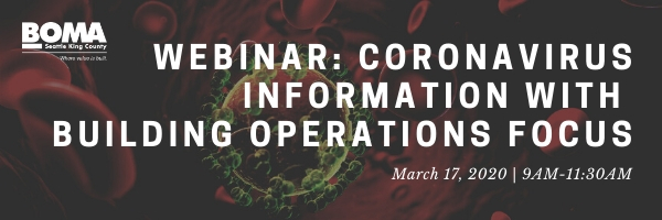 On March 17, 2020, BOMA Seattle King County presented a webinar called Coronavirus Information with Building Operations Focus. The webinar featured several panelists and the following topics were covered: Background on the Virus, Building Operations, Property Pandemic Response Plan Basics, and Personal/Family Preparedness.
