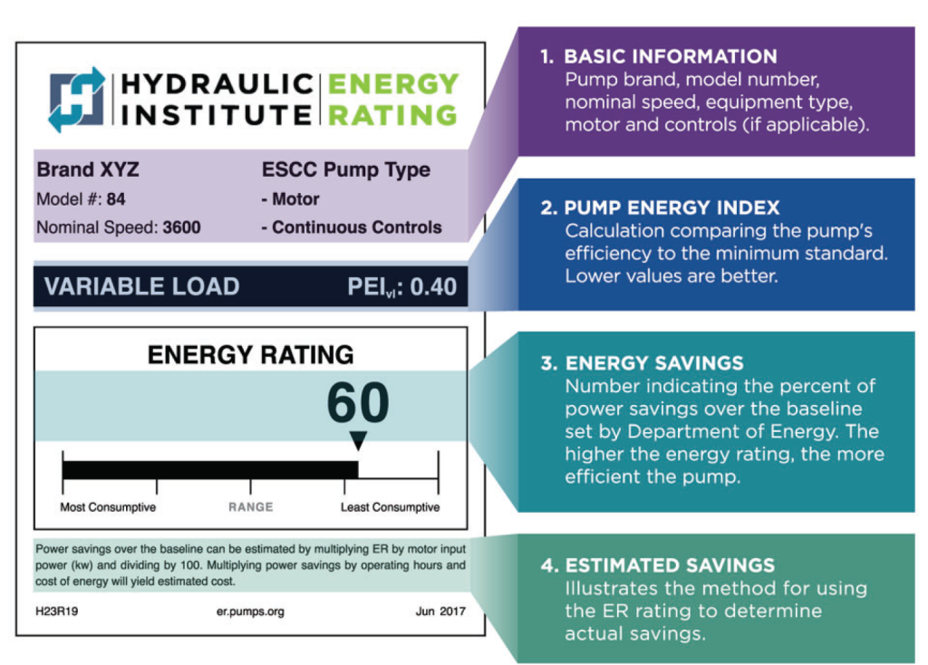 Energy Rating labels for commercial and industrial pump systems were created by the Hydraulic Institute in 2020 to foster an easier, streamlined way to determine the efficiency of a pump. Prior to the creation of the label, purchasers had to manually calculate efficiency based on multiple factors, which could lead to missed opportunities for improved energy performance and savings.