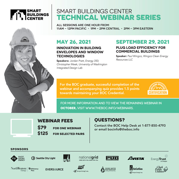 Join us for the next Smart Buildings Center (SBC) 2021 Technical Webinar on Innovation in Building Envelopes and Window Technologies on May 26th! This webinar will introduce building envelope improvements and window technologies such as secondary windows that can help optimize occupant comfort and building efficiency.