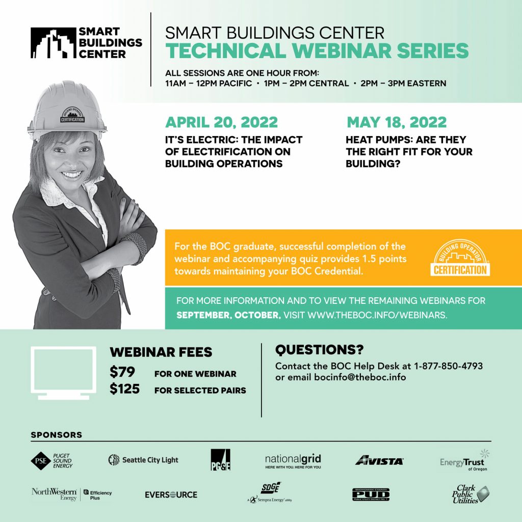 Join us for the next Smart Buildings Center (SBC) 2022 Technical Webinars on The Impact of Electrification on Building Operations on April 20th and Heat Pump Applications on May 18th!