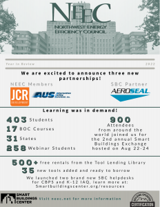 BOC training in our region offered a total of 17 courses. We trained over 400 students in NEEC territories alone, while training from our licensed partners reached O&M staff in 19 states. We also held our first pilot Multifamily BOC courses with a national reach and look to scale that program in 2023 to add it to our regular program offerings. Other news from the program includes the development and pilot of a class focused on Electrification and Building Operations in response to the growing push to decarbonize buildings, aligning with the recently announced renewed mission of NEEC.
