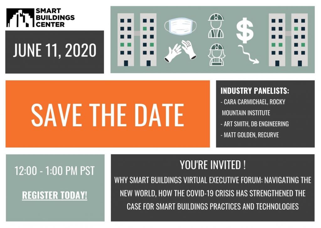 The Smart Buildings Center is excited to invite you to a Why Smart Buildings Virtual Executive Forum: Navigating the New World, How the COVID-19 Crisis Has Strengthened the Case for Smart Buildings Practices and Technologies. In this 60-minute webinar, we will hear from Cara Carmichael of the Rocky Mountain Institute, Art Smith of DB Engineering and Matt Golden of Recurve as they explore the impacts of the COVID-19 Pandemic on commercial buildings.